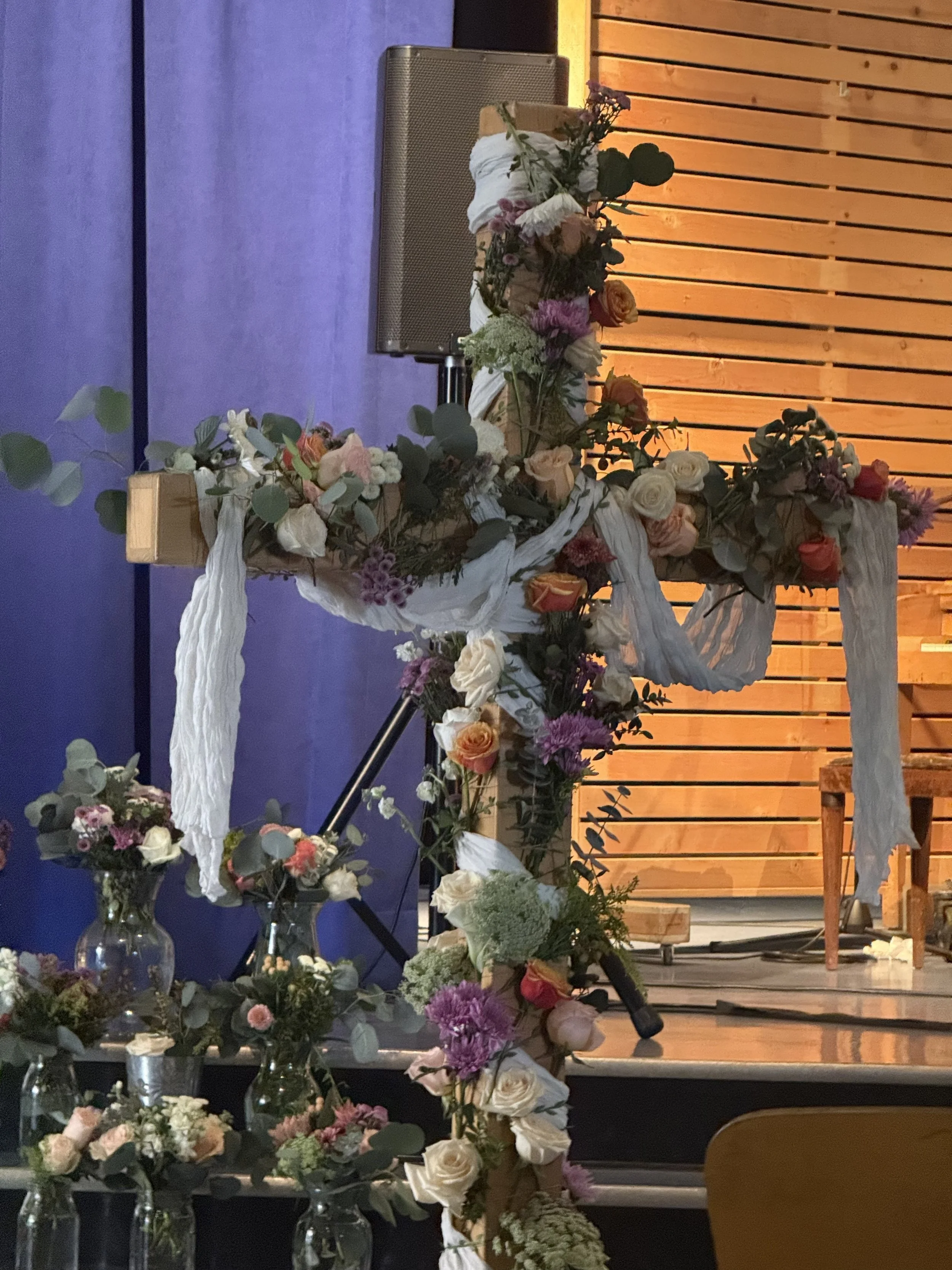On the floor near the stage was a cross, wrapped in twine and vines, draped with white cloth. It stood silently, but still communicating to me the pain and sadness associated with the crucifixion of Jesus, the wrapping of his body in cloth which was then laid in the tomb.