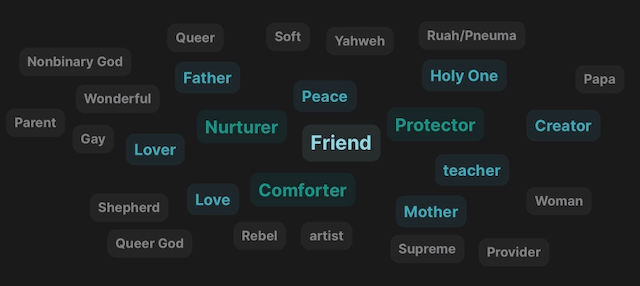 We embraced Rev. Dr. Gafney’s invitation on Sunday, each person gathered considering a name they might experiment with using to move toward and imagine God in a different way. Our reflections merged together into this word cloud: